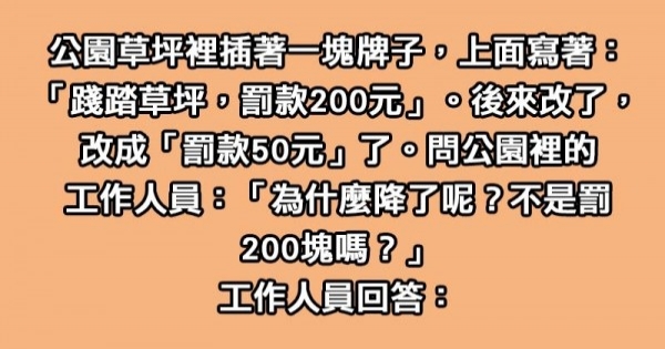 公園草坪裡插著一塊牌子,上面寫著:「踐踏草坪,罰款200元」。後來改了,改成「罰款50元」了。問公園裡的工作人員:「為什麼降了呢?不是罰200塊嗎?」