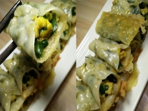 韭菜雞蛋鍋貼食材:雞蛋4個,韭菜一把,鹽少許,餃子皮
