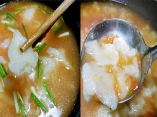 3、用筷子夾住一點麵糊,然後將兩根筷子分開就會出現薄薄的面塊,放進番茄湯裡面。看到面疙瘩飄起來就是煮熟了。