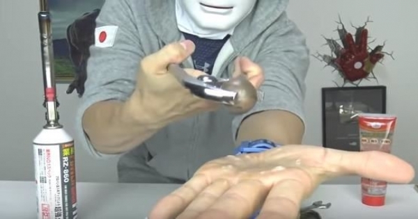 最後男子還是鼓起了勇氣在手上塗了一層厚厚的防護霜,男子為了讓測試鐵球的溫度是否達標,還用冰塊做了測試,冰塊接近鐵球的時候就快速融化了,男子抱頭看著鐵球,後悔自己做了這麼個裝逼的實驗,俗話說:「不作就不會si」男子現在收不了場了,隻能硬質頭皮做下去。