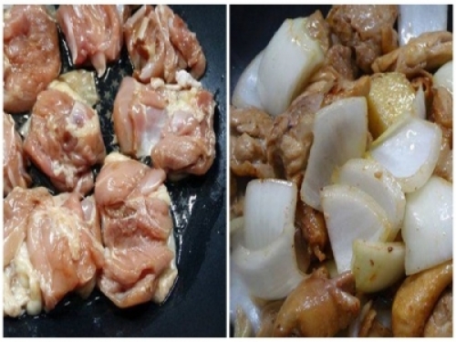 3.加入雞肉. 洋蔥和蒜片炒軟