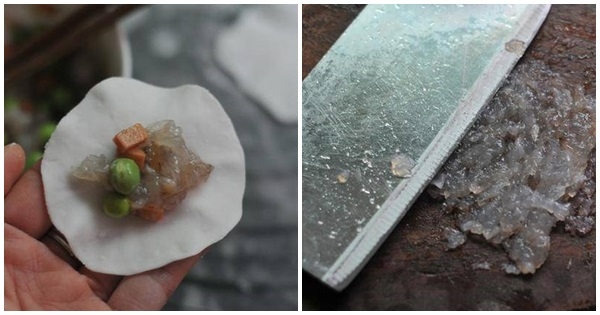 7、用筷子或者小勺子挑一團蝦餃餡放在水晶皮裡做餃子餡。