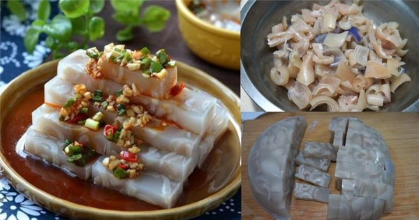 7.凝固結實的肉皮凍非常有彈性,從碗中倒扣出來,放在案板上;