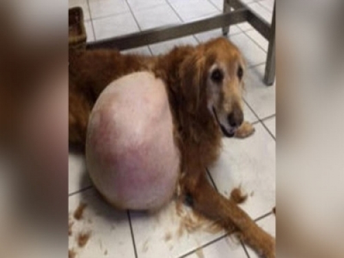 加州的一名飼主SherriHaughton帶她養的黃金獵犬看醫生,狗狗的身上長了一個46磅(約20公斤)的巨型腫瘤,幾乎是牠兩倍的體重。巨大的腫瘤已經壓迫牠的右腿,讓牠沒辦法正常走路。