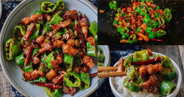 下一步,把火調到高火或中高火,然後把炒好的五花肉和辣椒加入到鍋裡,進行翻炒。如果使用的是磨碎的胡椒,此時添加到菜裡。