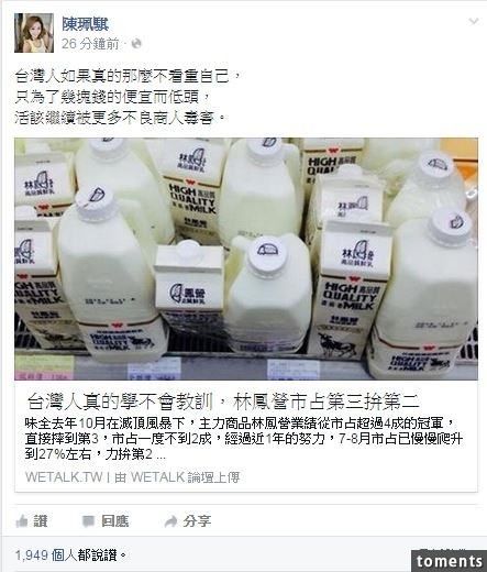 頂新味全旗下的牛奶品牌「林鳳營」七、八月的市占率坐三望二,藝人陳珮騏看不下去,覺得如果台灣人看到便宜就會埋單,就「活該繼續被更多不良商人毒害」。