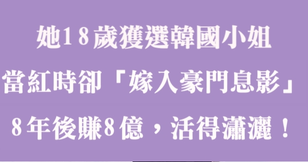 大家好,我是有錢人這麼想小編Pineapple!今天要來說說關於「她18歲獲選韓國小姐,當紅時卻「嫁入豪門息影」,8年後「離婚復出」怒賺8億,活得瀟灑!」的事!不知道大家對於這個有多了解呢?一起來看看吧!