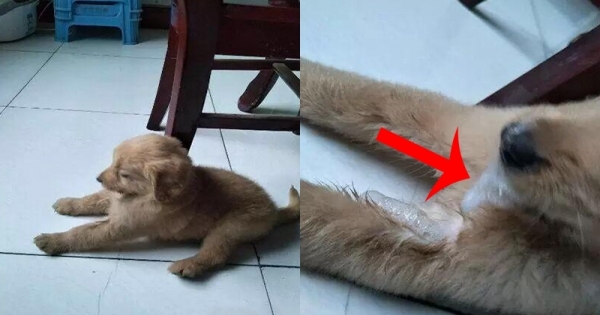 然而這次卻成了黃金的滑鐵盧,沒想到親戚的味道跟爸爸媽媽完全不一樣,簡直就是靈敏鼻子的剋星!主人忙著陪親戚,也沒注意黃金的表現,可等接待完親戚並送走之後,主人卻看見小黃金成這樣了: