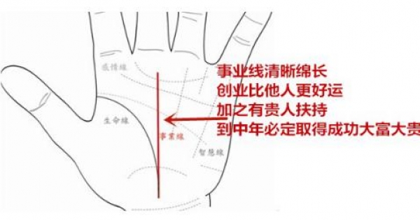事業線是從我們的手掌根部向上延伸的紋路,有的人的事業線一直向上延長到中指下方,事業線也可稱為命運線。事業線清晰深長的人,代表著他們在事業上可以比較平穩的發展,有穩固的根基,同時他們在創業的路上運勢特別好,加上有貴人相助,困難較少,因此他們在事業上比別人更容易取得成就獲得成功成功,到中年必定會大富大貴。