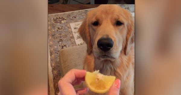 給金毛檸檬牠吃沒幾口就吐掉,正要把檸檬丟掉時金毛可愛的反應讓網友們全都笑炸啦!