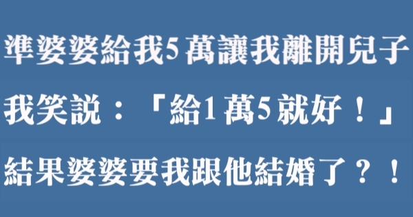 準婆婆給我5萬讓我離開她兒子,我笑說:「給1萬5就好!」沒想到她卻要求我跟他結婚了!