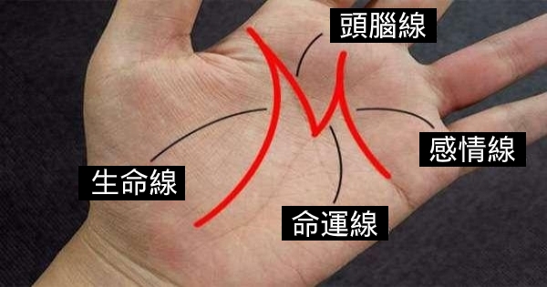 手上的四大紋路彙聚成"M"形,也就是四條線都非常均衡,
