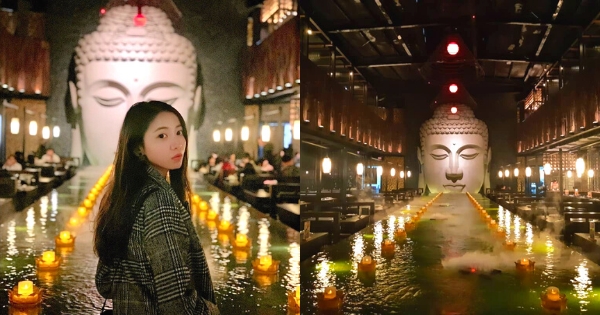 業者直接把超大型的釋迦摩尼佛「佛頭」跟巨大的「佛手」放在餐廳裡面,再加上特種裝潢、燈光營造出的高檔、古雅氛圍,真的會被震撼到!