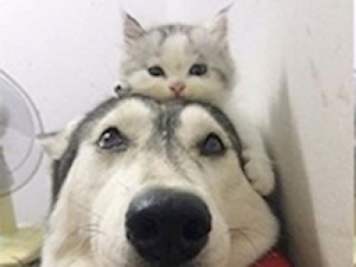 這隻貓從小時候開始就喜歡在二哈的頭上趴著,現在貓咪已經長大了,但牠的習慣還是一樣XDD
