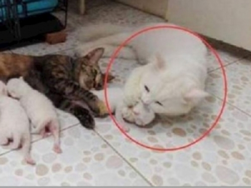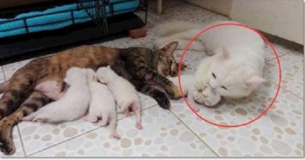網友跟過去一看,隻見鄰居養的貓咪正在哺乳,有寶寶了,而自己家的貓咪也趴在一旁,照顧著剛出生的貓咪寶寶...