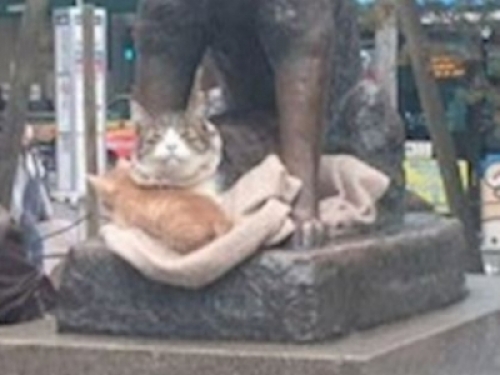 貓媽媽以及小貓窩在忠犬八公雕像下的照片,在推特上引發網友瘋傳