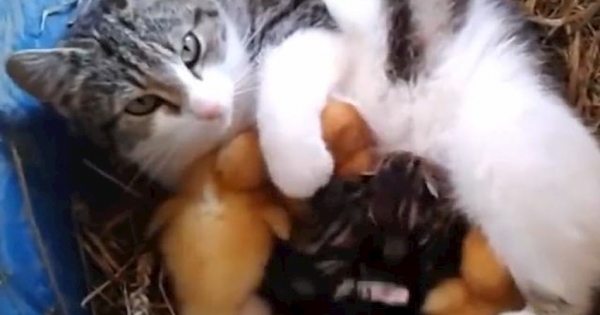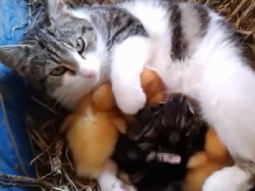 終於,鏟屎官看到黃色毛茸茸的小傢夥的嘴巴了,嗯,是鴨嘴......驚訝的鏟屎官小心翼翼地把喵星人抬起來,然後他就看到了三隻毛茸茸的小鴨子和兩隻小奶毛正和諧幸福地依偎在喵星人的懷裡,還對著鏟屎官嬌嫩地叫起來。