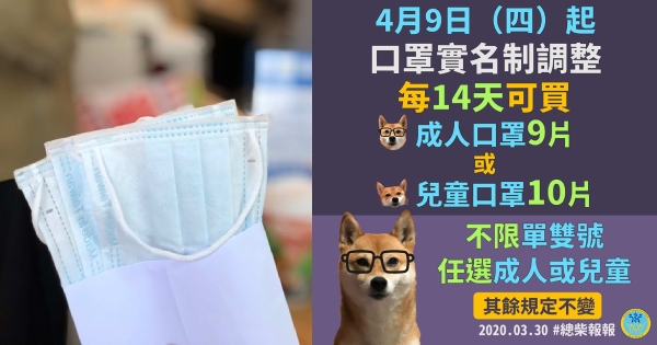 自4月9日起每14天可購買口罩,成人9片、兒童10片。