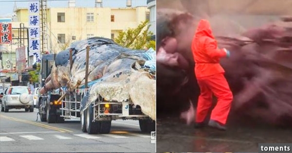 生命中的最後一次反擊?抹香鯨死岸邊被拔光牙齒,今天被拖上拖板車要被運到...!路上民眾看到這個畫面立馬就想起幾年前血染汽車的那隻...!