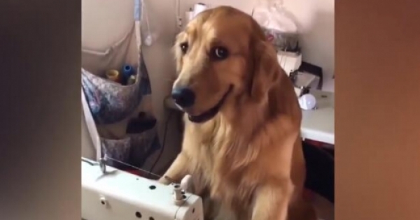 狗狗一點點的在縫著衣服,別看狗狗不會說話,就以為不懂事,這些成年的金毛就像一個小孩子一樣,其實很懂事的,只是不懂如何表達而已。