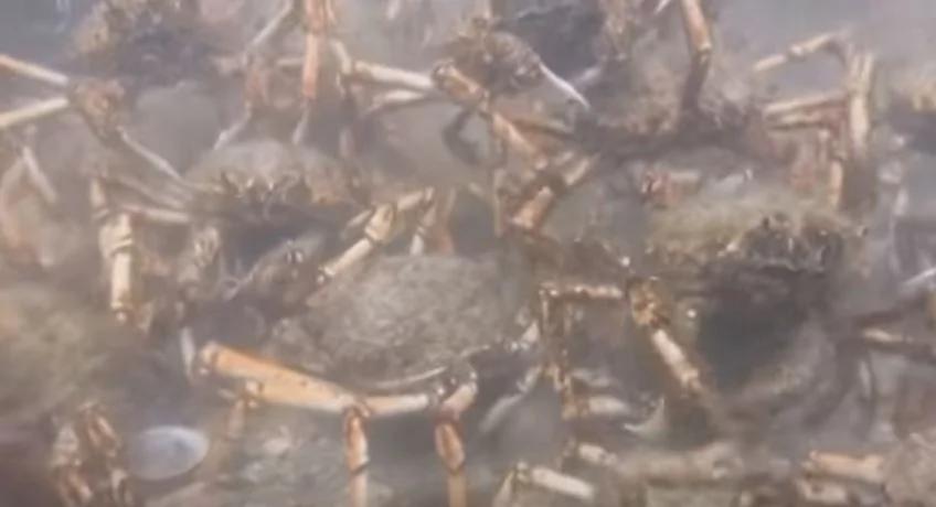 大批成群蜘蛛蟹攻佔沙灘,幾分鐘之內竟撕碎一隻大章魚...