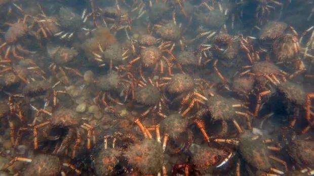 巨型蜘蛛蟹的生命周期鮮為人知,不過這次壯觀的年度聚會和它們的換殼期相吻合。蜘蛛蟹身體生長過程中,當原有的外殼將不再適合逐漸長大的身體時,其將褪下舊外殼,並慢慢長出新殼。在新外殼長出來之前,蜘蛛蟹非常脆弱,易受攻擊,這對於捕食者而言是絕對的好消息。在這段時間裏,黃貂魚、鯊魚、海豚和海鳥都十分熱衷捕食這些軟殼蜘蛛蟹。圖為視頻中的巨型蜘蛛蟹。