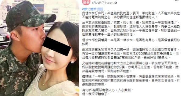 軍人尪陪伴少月給7萬彌補 妻「領光3800萬」跑路