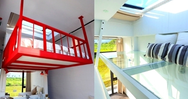 Z字型的床舖設計,簡約白及透明玻璃的閣樓有夠時尚,廁所以大片拉門做隔間,粗獷味十足,衝突的美感達到一種微妙的平衡!
