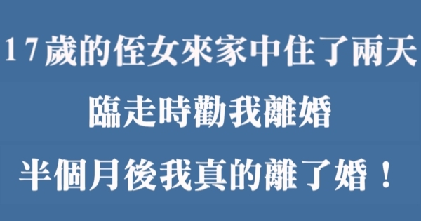 17歲的侄女來家中住了兩天,臨走時勸我跟老婆離婚,半個月後我發現「這一幕」真的離婚了!