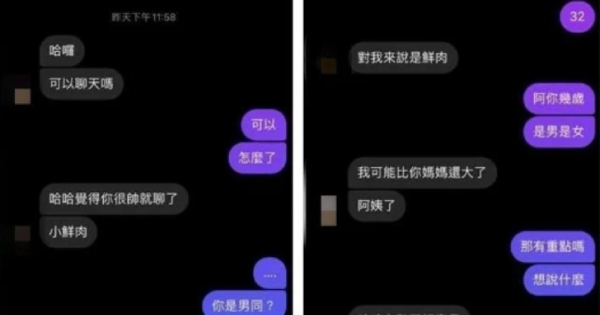 從照片中可以看到,阿姨突然私訊原PO朋友,並直接表明意圖 「覺得你很帥就聊了,小鮮肉」、「哈哈有點不好意思,想來找鮮肉,給你錢」。