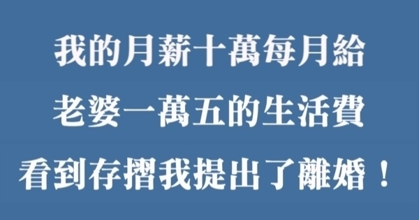 我月薪10萬,每月給老婆1萬5的零用錢,看到存摺我提出了離婚!