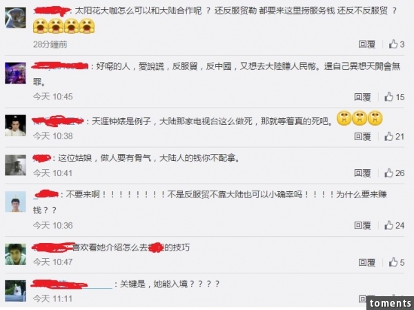 不過消息一出現在微博,馬上引來許多中國網友的謾罵,有人嗆︰「大陸哪個電視台或者網站敢請她主持節目就是自找死路!」更有人表示︰「太陽花大咖怎麼可以和大陸合作呢 ?還反服貿勒,都要來這裡撈服務錢,還反不反服貿?」最後更有人質疑︰「她能入境?」