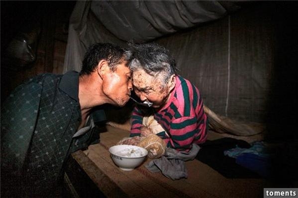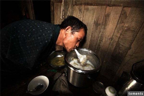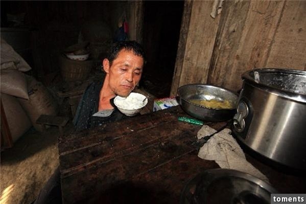 由 於母親上月生病開始臥床不起,手腳無力,他不得不以自己特有的方式給母親喂飯——先用嘴銜起飯勺,從電飯煲裡一勺一勺舀出半碗米飯,然後蹲下身子,歪著下 巴把飯碗挪到肩膀上夾穩,再「端」進母親的房間,俯下身子把碗放到母親床邊,再俯身讓母親扶著他的肩膀慢慢坐起來。然後,他用嘴銜起湯匙,舀飯湊到母親嘴 邊,一勺、兩勺、三勺……,直到母親吃飯搖頭為止。