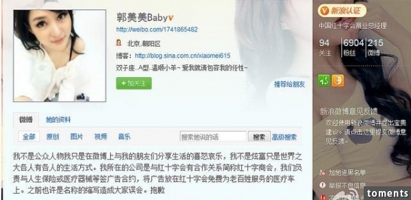 她新浪微博暱稱「郭美美 baby」,她曾在新浪微博炫富,並牽扯上中國紅十字會而引起廣泛關注及爭議。