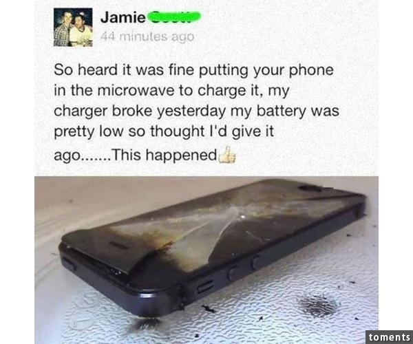 Jamie:“ 我聽說可以把手機放進微波爐充電,我的充電器昨天壞掉了,所以我決定放手一搏,然後就變成這樣了”