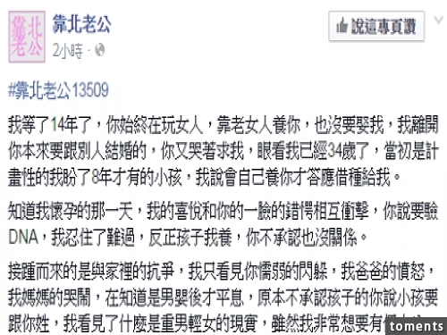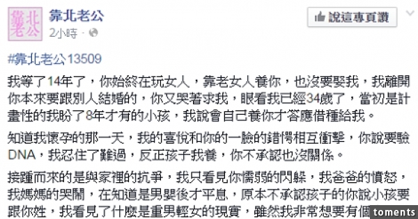 我等了14年了,你始終在玩女人,靠老女人養你,也沒要娶我,我離開你本來要跟別人結婚的,你又哭著求我,眼看我已經34歲了,當初是計畫性的我盼了8年才有的小孩,我說會自己養你才答應借種給我。