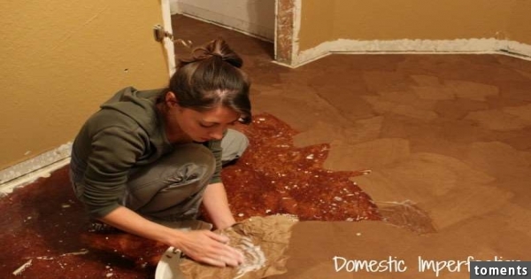 她靈光一閃,想到了便宜裝修房間地板的好方法。她買了一大卷裝修用的牛皮紙、一加侖膠水、砂紙、拖把、油性染料和用於地板的水性聚氨酯樹脂,成本約80美金。
