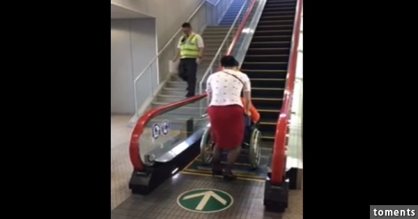 一名女性居然想將坐著輪椅的老人給推上手扶梯,大家急忙想衝上前阻止,但沒想到下一秒竟.....讓眾人全驚呆了!!!!
