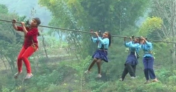 國外尼泊爾的Benighat就是這樣一個地方,這裡的學童,每天上學都需要這樣攀著繩索,靠自己的力量一點一點往前進,才有辦法上學,就連大人們要帶物品過河,也必須像這樣用一隻手抱住貨物、一手抓繩爬,然而這就是他們的日常!!!