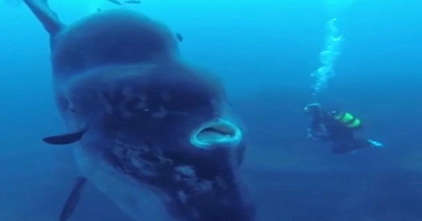 這個巨大的陰影速度很快,還沒等佩雷拉反應過來,就出現在他身邊,佩雷拉認真一看,原來是一條巨大的翻車魚,一條大型翻車魚體重在1.5噸左右,體長可以達到5米以上,半層樓高,這是一種典型的大洋生物,近岸很少出現。佩雷拉在現場估計,這條翻車魚重量可能達到2噸,體長在5米左右,如此活物從潛水員身後悄悄出現,或許這種感覺正是潛水探險者想要的,刺激。