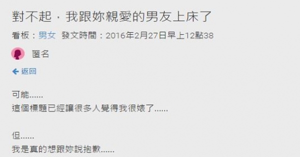 對不起,我跟妳親愛的男友上床了,只因為......!!!沒想到看到後大家反而說小三「做的好」?!
