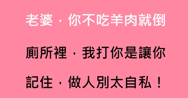 看完後是不是覺得Choco小編在有錢人這麼想分享的女人故事文章讓人深思呢?想看更多好文,或是喜歡有錢人這麼想的文章的話,可以按讚追蹤真愛每一天並分享這篇「老婆,你不吃羊肉就倒廁所裡,我打你是讓你記住,做人別太自私!」出去給大家一起看看!