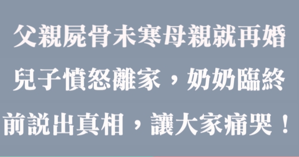大家好,我是有錢人這麼想小編Choco!今天要來說說關於「父親屍骨未寒母親就再婚,兒子憤怒離家,奶奶臨終前說出真相,讓大家痛哭!」的事!不知道大家對於這個有多了解呢?一起來看看吧!