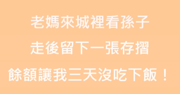 各位讀者安安阿~~我是有錢人這麼想小編Choco!今天要來說說關於「老媽來城裡看孫子,走後留下一張存摺,餘額讓我三天沒吃下飯!」,不知道大家有沒有興趣呢!一起來看看吧!
