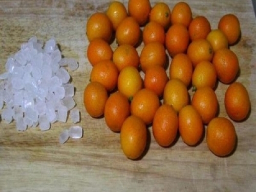 4.冰糖煮化後,插進金桔調中火熬4、50分鐘,熬至金桔皮變得透明,放入3克鹽拌勻即可
