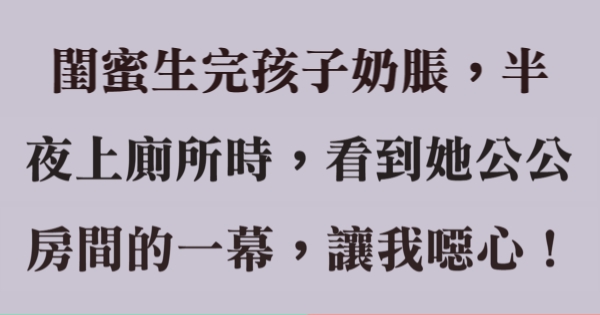 哈摟哈摟各位讀者~~我是有錢人這麼想小編Choco!今天要來說說關於「閨蜜生完孩子奶脹,半夜上廁所時,看到她公公房間的一幕,讓我噁心!」,不知道大家有沒有興趣呢!一起來看看是怎麼樣的事吧!