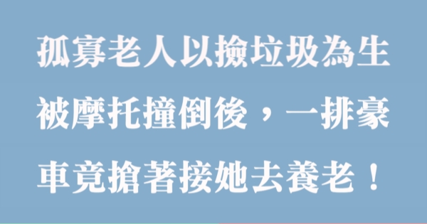大家好,我是Choco 今天來跟你說說 孤寡老人以撿垃圾為生,被摩托撞倒後,一排豪車竟搶著接她去養老!吧!