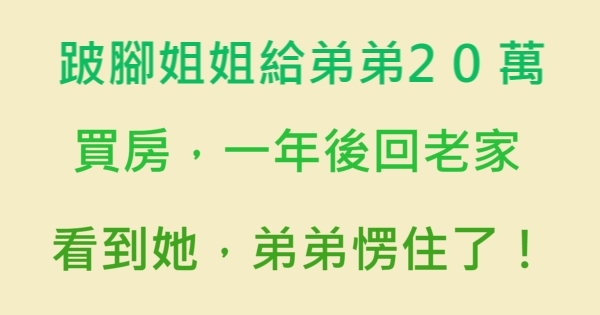 大家好,我是有錢人這麼想小編Choco!今天要來說說關於「跛腳姐姐給了弟弟20萬買房,一年後回老家看到她,弟弟愣住了!」的事!不知道大家對於這個有多了解呢?一起來看看吧!