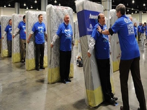 據《khaleejtimes》報導,美國電子大廠〝Aaron〞的1200名員工,在馬里蘭州的會議中心參加〝人體床墊骨牌〞大賽,最後於13分38秒內完成,成功超越上屆1150個床墊的吉尼斯世界紀錄。