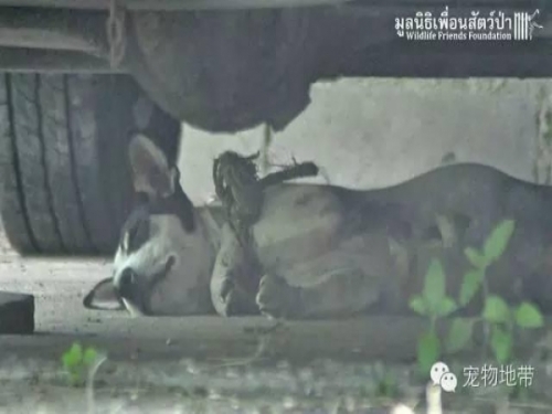 在泰國有人發現一對好特別的狗狗母子,狗媽媽一條前腿被人用很粗的繩子捆綁著,繩子把它的腳切出一個很深的傷口。而小狗狗剛出生不久,還在喝奶!